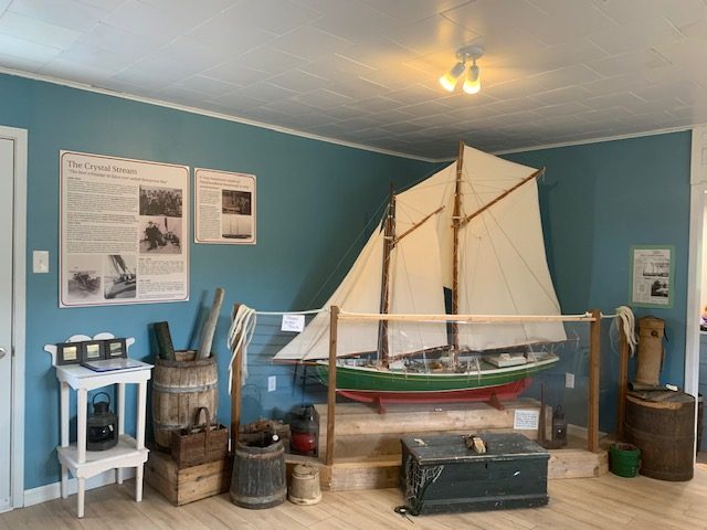 Located on the most easterly point of the Eastport Peninsula, lies the 300-year-old fishing community of Salvage. Known as the Lane/Heffern House, the Salvage Fisherman’s Museum was created in 1969 and is recognized as one of the oldest in the province. Due to its historic and aesthetic value it was designated as a Registered Heritage Structure in 2020. The house, believed to have been built in the mid-19th century and expanded upon in the 1880’s by Charles Lane, is representative of a traditional Newfoundland saltbox dwelling. Its collection of early fishing equipment, logging tools, and domestic artifacts reflect the community’s history and that of its residents. Highlights include a 2-metre-long wooden model of a locally built schooner (the Crystal Stream), sets of church records dating back to the early 1800’s, a death shroud, and a scrimshaw engraved powder horn dating back to 1875.